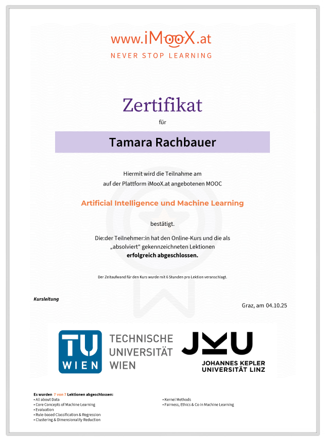 Zertifikat über die Teilnahme am Seminar: Artificial Intelligence und Machine Learning auf der Plattform iMooX.at (10.2025)