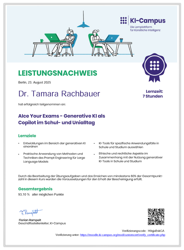 Leistungsnachweis über die Teilnahme am Seminar: AIce Your Exams - Generative KI als Copilot im Schul- und Unialltag am KI-Campus (08.2025)