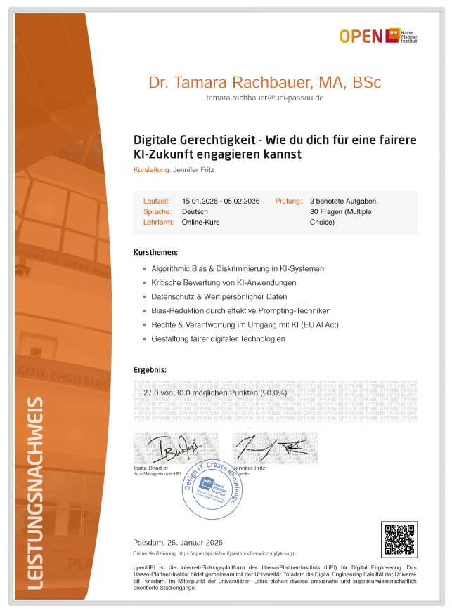 Leistungsnachweis über die Teilnahme am Seminar: Digitale Gerechtigkeit - Wie du dich für eine faire KI-Zukunft engagieren kannst am open HPI (15.01.2026-05.02.2026)