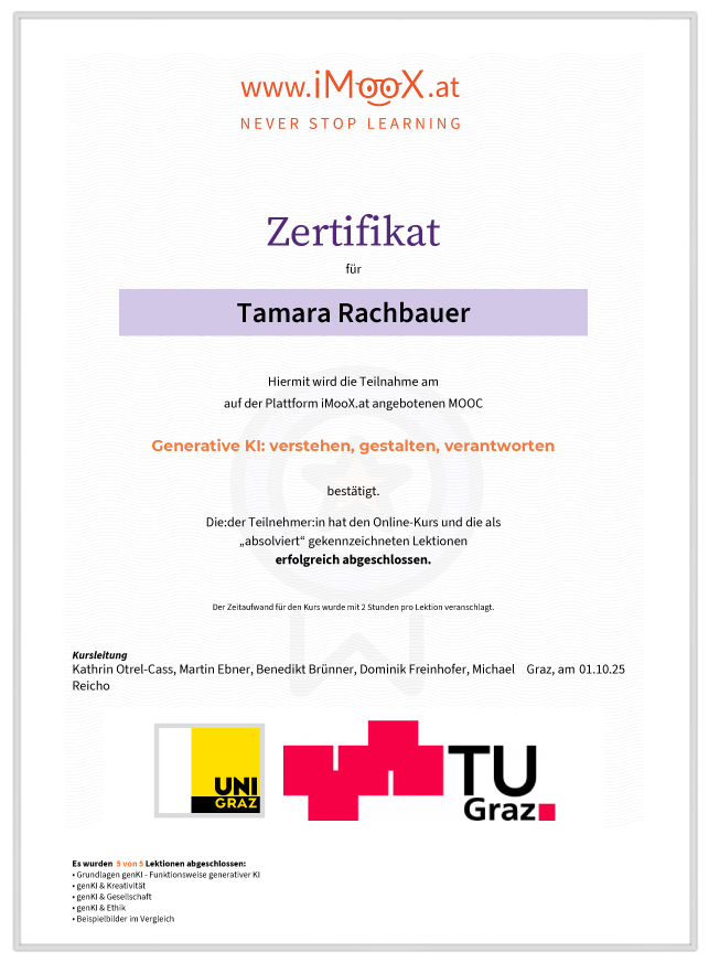 Zertifikat über die Teilnahme am Seminar: Generative KI: verstehen, gestalten, verantworten auf der Plattform iMooX.at (10.2025)