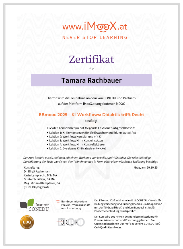 Zertifikat über die Teilnahme am Seminar: KI-Workflows: Didaktik trifft Recht auf der Plattform iMooX.at (10.2025)