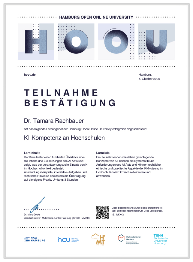 Teilnahmebestätigung über die Teilnahme am Seminar: KI-Kompetenzen an Hochschulen auf der Plattform HOOU (10.2025)