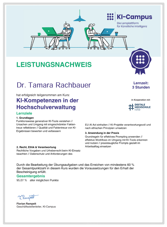 Leistungsnachweis über die Teilnahme am Seminar: KI-Kompetenzen in der Hochschulverwaltung am KI-Campus (08.2025)