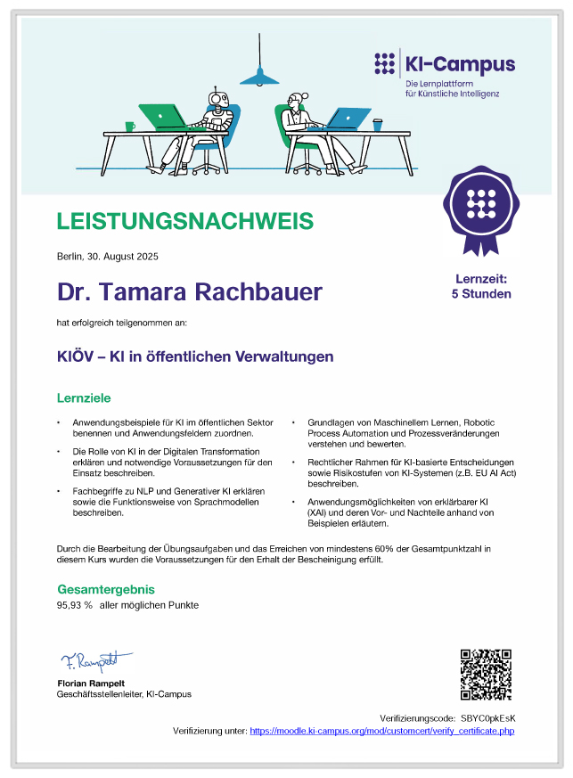 Leistungsnachweis über die Teilnahme am Seminar: KIÖV - KI in öffentlichen Verwaltungen am KI-Campus (08.2025)
