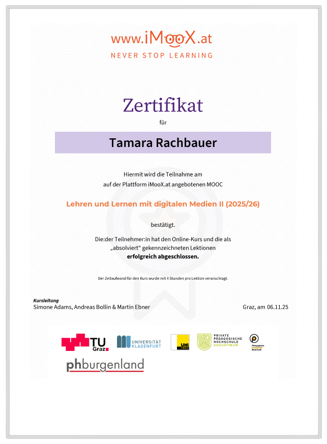 Zertifikat über die Teilnahme am Seminar: Lehren und Lernen mit digitalen Medien II (2025/26) auf der Plattform iMooX.at (11.2025)