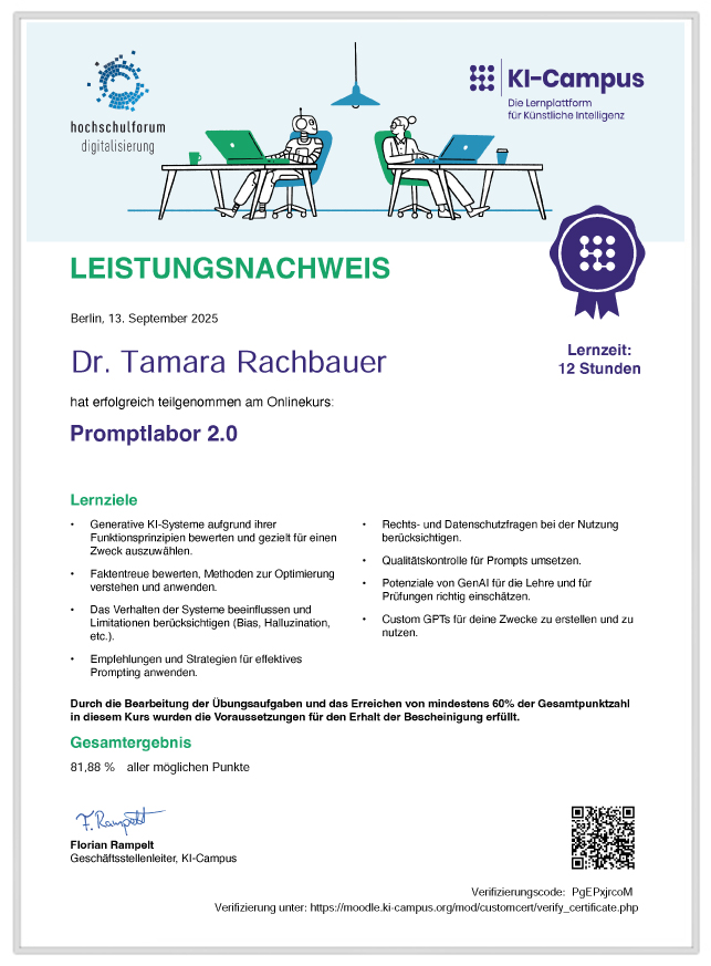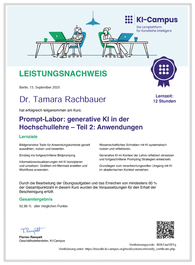 Leistungsnachweis über die Teilnahme am Seminar: Prompt-Labor: generative KI in der Hochschullehre - Teil 2: Anwendungen am KI-Campus (09.2025)