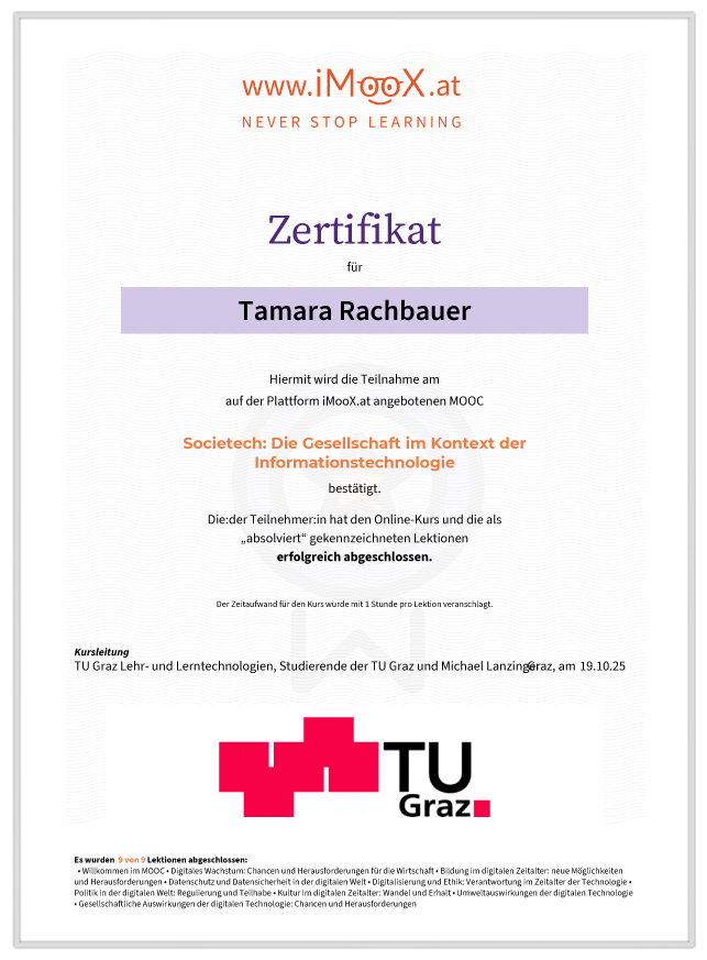 Zertifikat über die Teilnahme am Seminar: Societech: Die Gesellschaft im Kontext der Informationstechnologie auf der Plattform iMooX.at (10.2025)