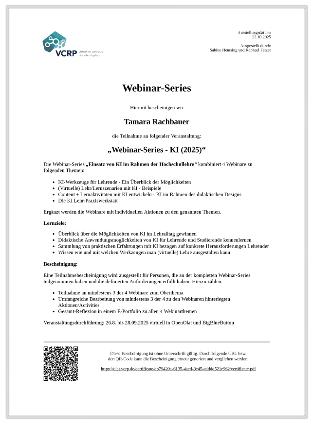 Bescheinigung über die Teilnahme an der Webinar-Series - KI (2025) am VCRP (08.2025-09.2025)
