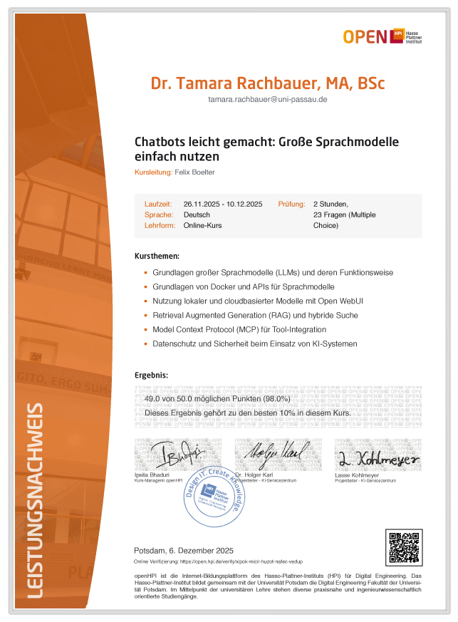 - Leistungsnachweis über die Teilnahme am Seminar: Chatbots leicht gemacht: Große Sprachmodelle einfach nutzen am open HPI (026.11.2025-10.12.2025)