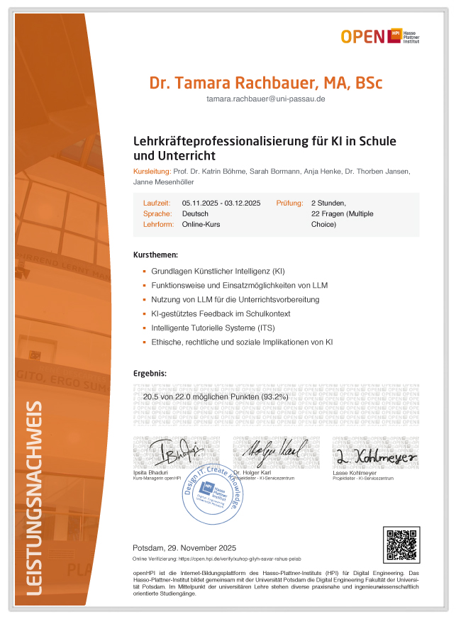- Leistungsnachweis über die Teilnahme am Seminar: Lehrkräfteprofessionalisierung für KI in Schule und Unterricht am open HPI (05.11.2025-03.12.2025)