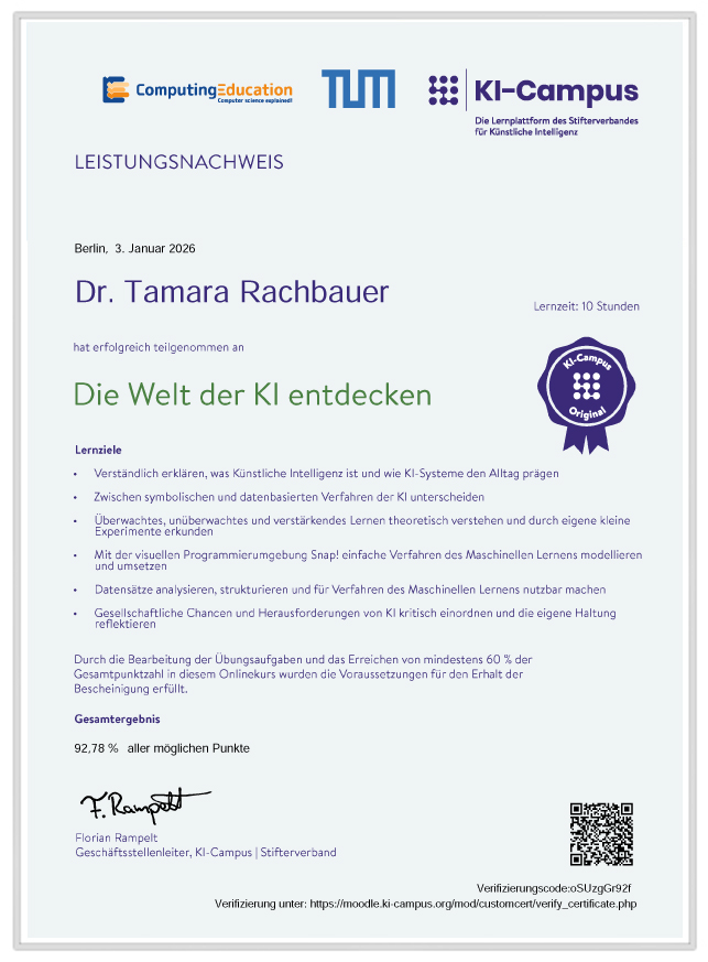 - Leistungsnachweis über die Teilnahme am Seminar: Die Welt der KI entdecken am KI-Campus (01.2026)